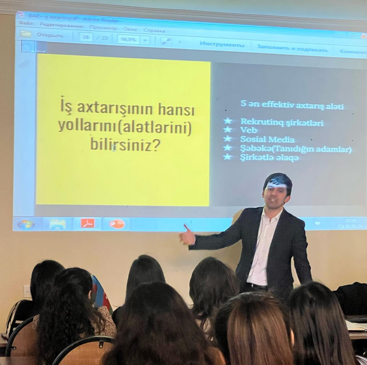 Təlimdə tələbələrə ənənəvi və müasir iş axtarma alətləri, bazar dəyərini artırmağın yolları, şəxsi brendiqin bazar dəyərində rolu kimi bir sıra məsələlərə toxunulub.Təlim interaktiv şəkildə 1,5 saata yaxın davam edib. Tələbələrin sualları cavablandırılıb və xatirə şəkilləri çəkdirilib.